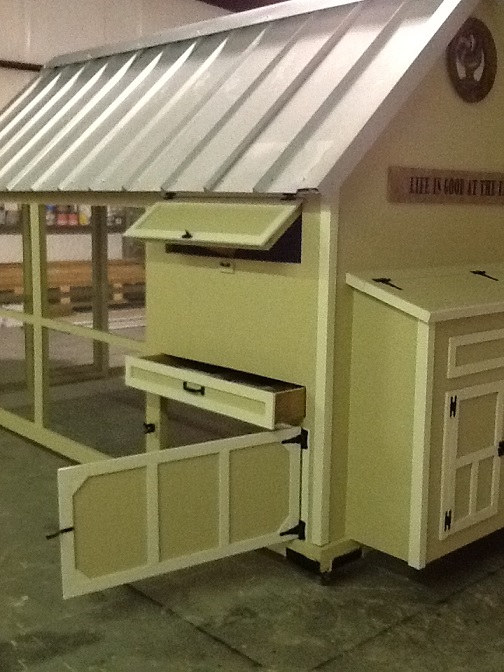 - outside 4 unit covered nest box,(door opens from top), 2 bottom of run side barn style doors,roosting area has shaving clean out drawer .black hindges,black outside light(decoration only) This fancy chicken coops was custom designed to match the Riddle family ranch house colors and tin roofs. we love their choice of the custon tin roof and painted siding they chose!
