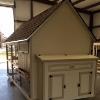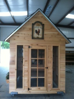 - Shingled roof, painted siding, nest/roosting area, two roosting poles,slide up run door, barn style small door, front walk in screen door, 2 screen windows units.