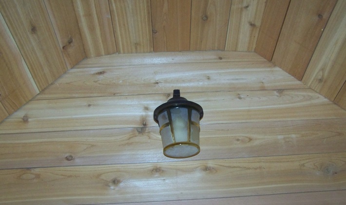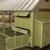 - outside 4 unit covered nest box,(door opens from top), 2 bottom of run side barn style doors,roosting area has shaving clean out drawer .black hindges,black outside light(decoration only) beautifully painted coop.
