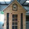 - Cedar, Shingled roof, nest/roosting area, two roosting poles,slide up run door, barn style small door, front walk in screen door, 2 screen windows units.